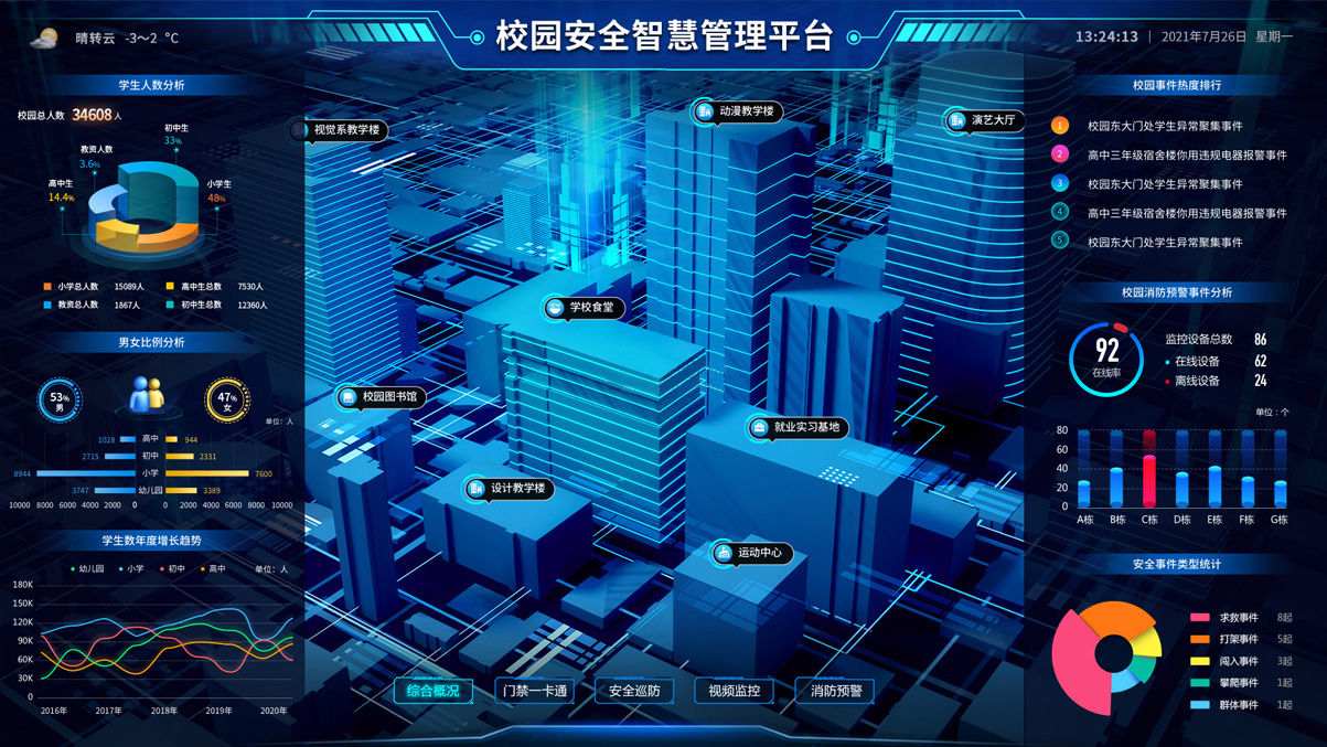 全方位立體式還原院區(qū)實貌,分圖層對院區(qū)的區(qū)域、建筑、單位、安防設(shè)備、管理設(shè)備、警情等進(jìn)行查看、監(jiān)控和跟蹤;通過院區(qū)各類安防管理設(shè)備實時獲取各重點監(jiān)控區(qū)域的監(jiān)控數(shù)據(jù),對各種突發(fā)事件進(jìn)行報警。通過人臉識別、車牌識別、行為識別、武器管理、營區(qū)設(shè)備等各類傳感器,對人、車、物及其行為的全面感知,保障營區(qū)安全。 -