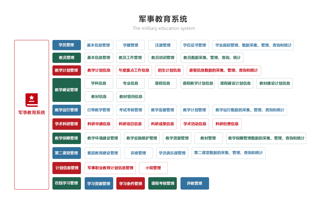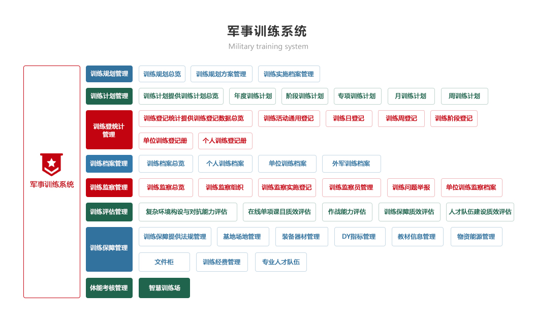 包括訓(xùn)練計劃、訓(xùn)練檢查、訓(xùn)練考核、訓(xùn)練檔案、訓(xùn)練資源模塊,實現(xiàn)對訓(xùn)練計劃制定情況自動統(tǒng)計和智能分析、逐步解決訓(xùn)練時間、訓(xùn)練人員落實情況、實現(xiàn)智能報靶和體能訓(xùn)練監(jiān)測、實現(xiàn)網(wǎng)上模擬訓(xùn)練與考核的智能化、自動化和便捷化,對訓(xùn)練資源科學(xué)管理,確保為軍事訓(xùn)練工作有力支撐。