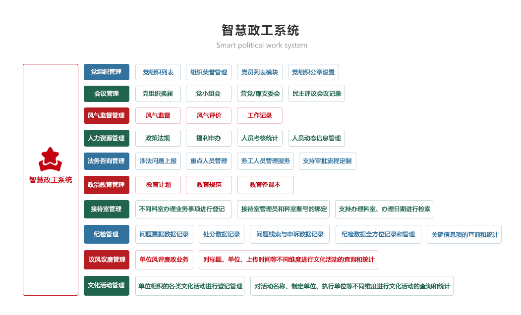 包含控制臺、組織架構(gòu)、黨建動態(tài)、黨員學(xué)習(xí)、組織活動、志愿服務(wù)、黨費管理、監(jiān)督執(zhí)紀(jì)功能模塊。通過黨建在線學(xué)習(xí)教育,解決黨建學(xué)習(xí)難問題,實現(xiàn)便捷化管理;黨務(wù)工作流程及黨建資訊全掌握、黨建工作全方位可視,統(tǒng)一數(shù)據(jù)標(biāo)準(zhǔn),智能分析績效考評,成績一目了然,做到數(shù)據(jù)指標(biāo)化;積極推進(jìn)黨建工作高效完成,信息高效處理。